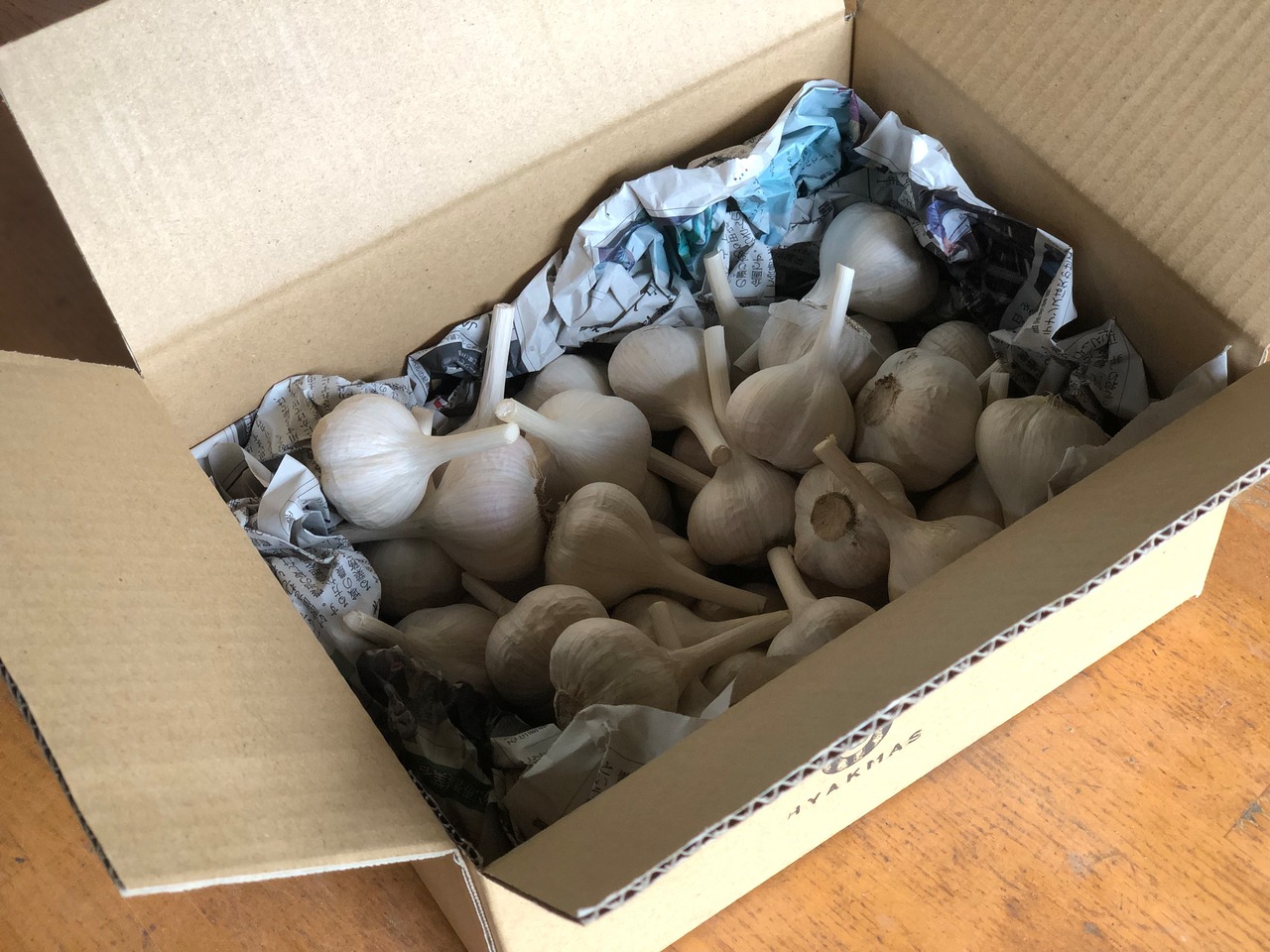 ダンボールに緩衝材として古新聞を使用し、バラに入れて常温便でお届けします。