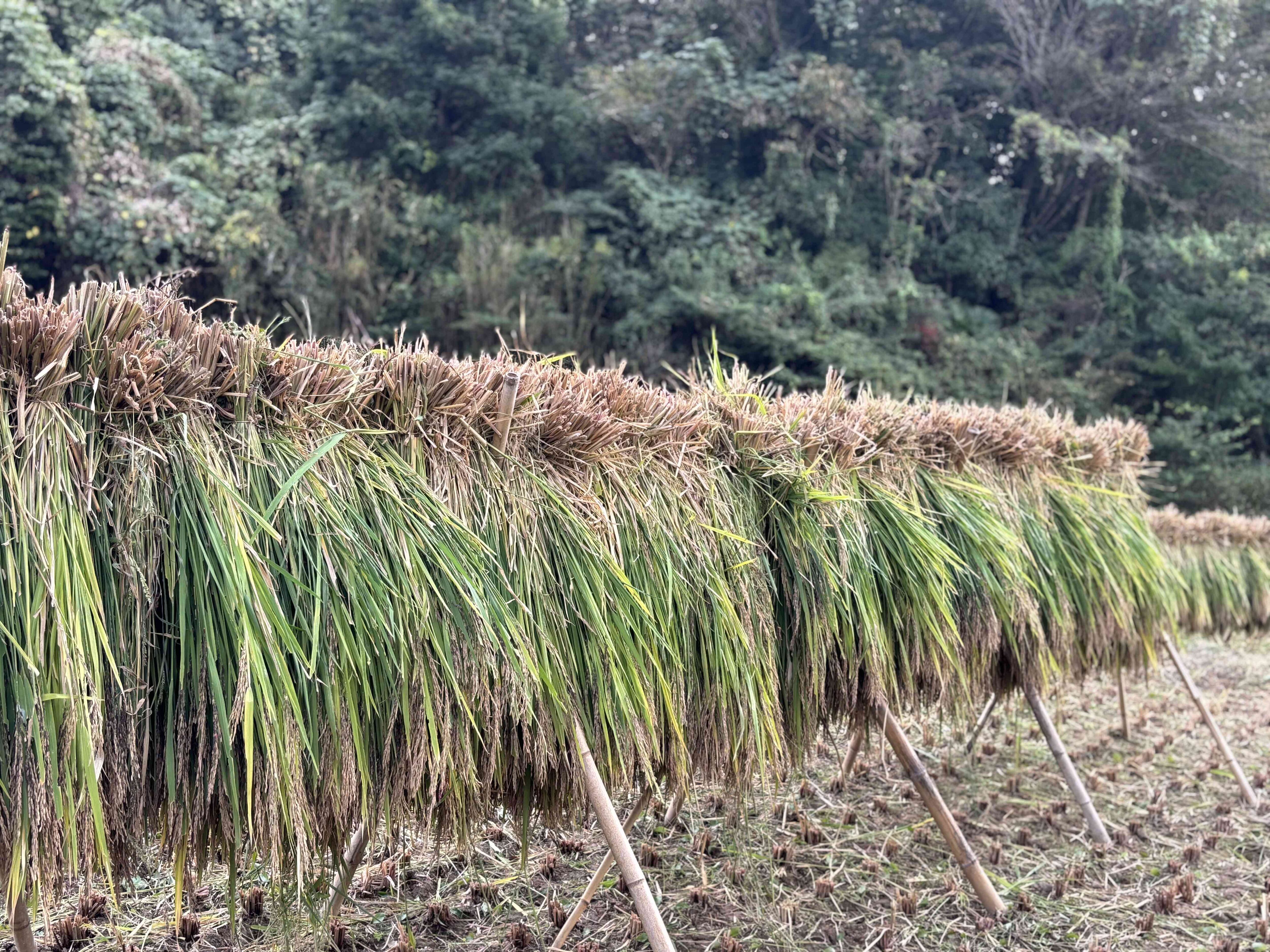 9月に稲を刈り、竹で作ったハザに掛けて天日干して、